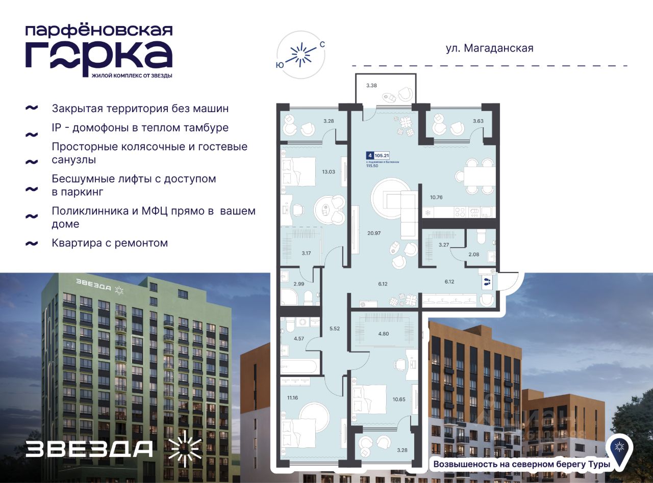 Название ЖК — не просто метафора, а часть истории Тюмени. В XVII веке на северном берегу Туры на возвышении основали деревню Парфенова. Сегодня на этом месте "Звезда" возводит современный ЖК комфорт-класса. Проект комплексного развития территории преобразит знакомый район Тюмени. В локации построят поликлинику с дневным стационаром на 100 посещений в смену и МФЦ. На первых этажах ЖК откроются супермаркеты, магазины, салоны и сервисы на каждый день — всё, что необходимо для комфортной жизни. Обслуживать дома будет сервисная компания "Звезда Управляет".