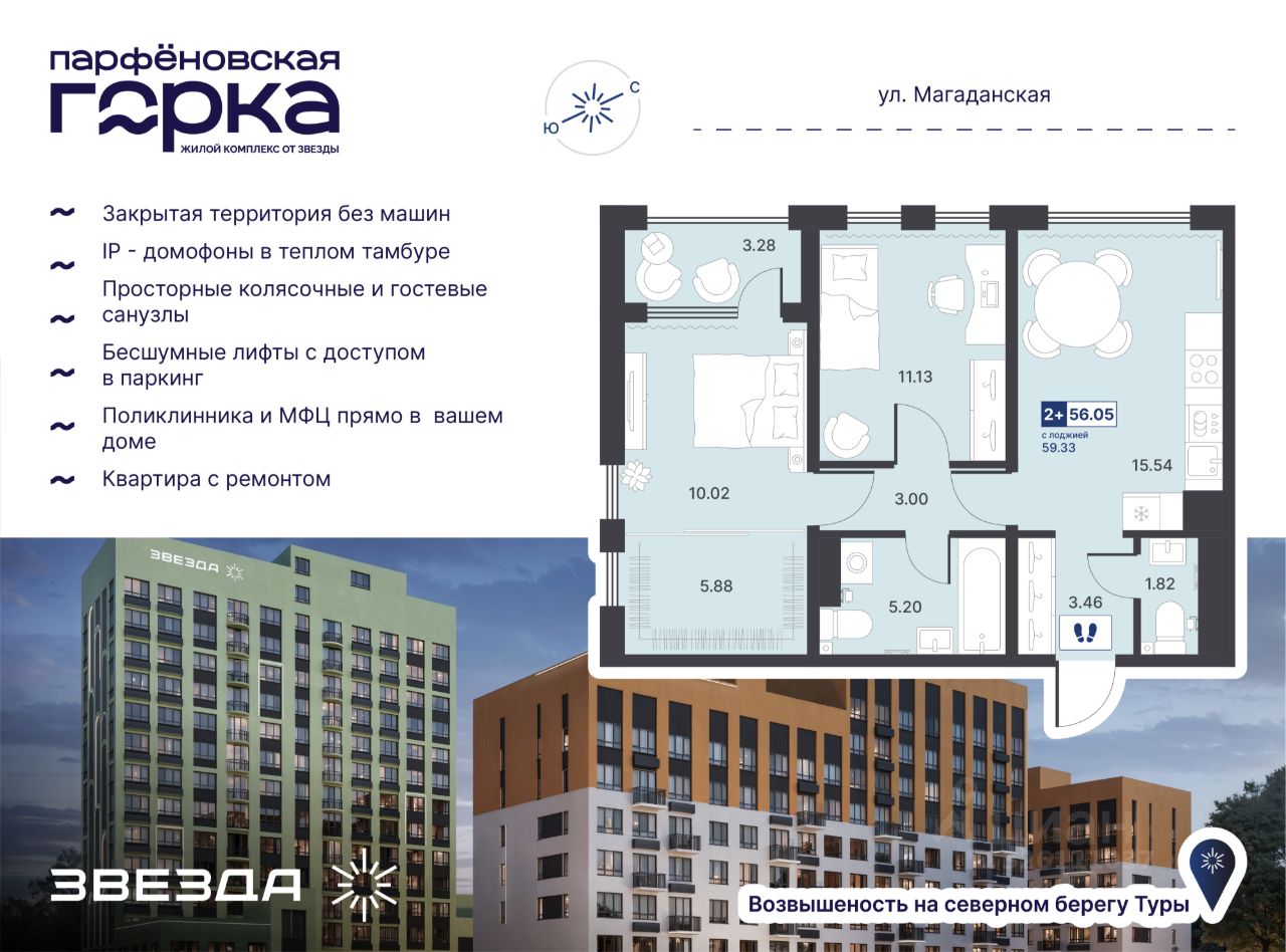 Название ЖК — не просто метафора, а часть истории Тюмени. В XVII веке на северном берегу Туры на возвышении основали деревню Парфенова. Сегодня на этом месте "Звезда" возводит современный ЖК комфорт-класса. Проект комплексного развития территории преобразит знакомый район Тюмени. В локации построят поликлинику с дневным стационаром на 100 посещений в смену и МФЦ. На первых этажах ЖК откроются супермаркеты, магазины, салоны и сервисы на каждый день — всё, что необходимо для комфортной жизни. Обслуживать дома будет сервисная компания "Звезда Управляет".