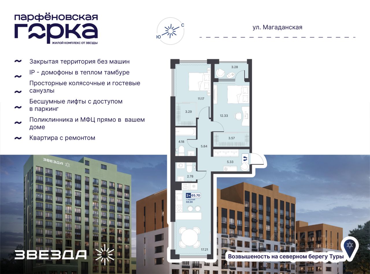 Название ЖК — не просто метафора, а часть истории Тюмени. В XVII веке на северном берегу Туры на возвышении основали деревню Парфенова. Сегодня на этом месте "Звезда" возводит современный ЖК комфорт-класса. Проект комплексного развития территории преобразит знакомый район Тюмени. В локации построят поликлинику с дневным стационаром на 100 посещений в смену и МФЦ. На первых этажах ЖК откроются супермаркеты, магазины, салоны и сервисы на каждый день — всё, что необходимо для комфортной жизни. Обслуживать дома будет сервисная компания "Звезда Управляет".