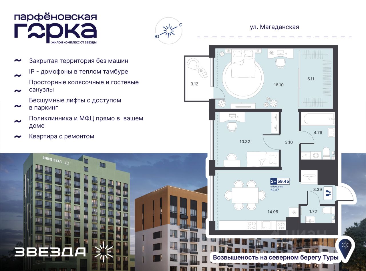 Название ЖК — не просто метафора, а часть истории Тюмени. В XVII веке на северном берегу Туры на возвышении основали деревню Парфенова. Сегодня на этом месте "Звезда" возводит современный ЖК комфорт-класса. Проект комплексного развития территории преобразит знакомый район Тюмени. В локации построят поликлинику с дневным стационаром на 100 посещений в смену и МФЦ. На первых этажах ЖК откроются супермаркеты, магазины, салоны и сервисы на каждый день — всё, что необходимо для комфортной жизни. Обслуживать дома будет сервисная компания "Звезда Управляет".