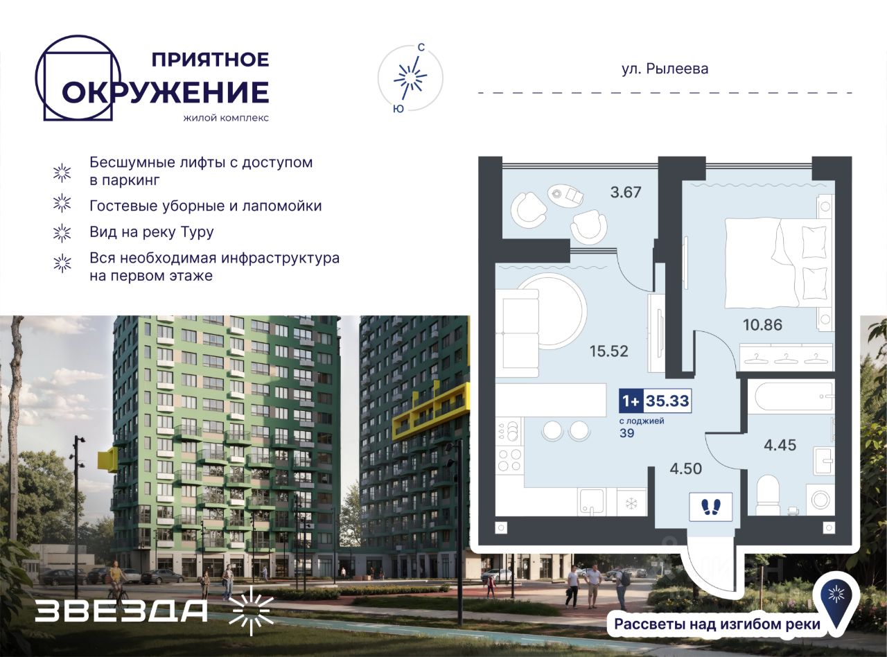 ЖК "Приятное окружение" комфорт-класса сочетает лаконичную архитектуру, продуманное благоустройство и эргономичные планировки. Двухсекционный дом с переменной этажностью расположен в уникальном месте: с одной стороны — дамба, с другой — зелёные массивы. Важно, что на стороне дамбы не предусмотрено строительство новых домов, а значит, из окон комплекса всегда будут открываться живописные виды на природный ландшафт. Есть квартиры с панорамными окнами и видами на набережную и мост Влюбленных. А в праздничные дни можно любоваться фейерверками, не выходя из дома.