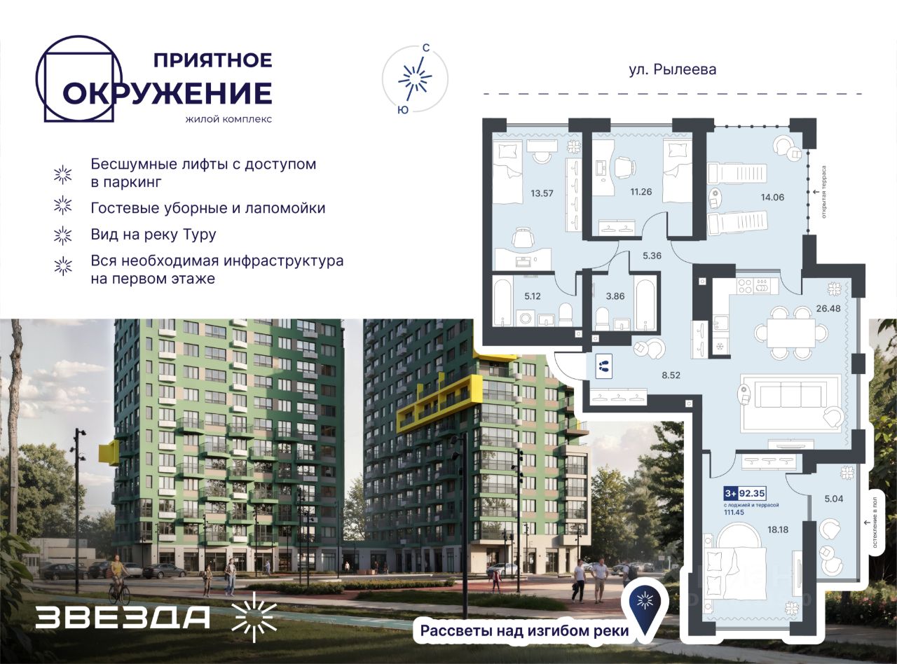 ЖК "Приятное окружение" комфорт-класса сочетает лаконичную архитектуру, продуманное благоустройство и эргономичные планировки. Двухсекционный дом с переменной этажностью расположен в уникальном месте: с одной стороны — дамба, с другой — зелёные массивы. Важно, что на стороне дамбы не предусмотрено строительство новых домов, а значит, из окон комплекса всегда будут открываться живописные виды на природный ландшафт. Есть квартиры с панорамными окнами и видами на набережную и мост Влюбленных. А в праздничные дни можно любоваться фейерверками, не выходя из дома.