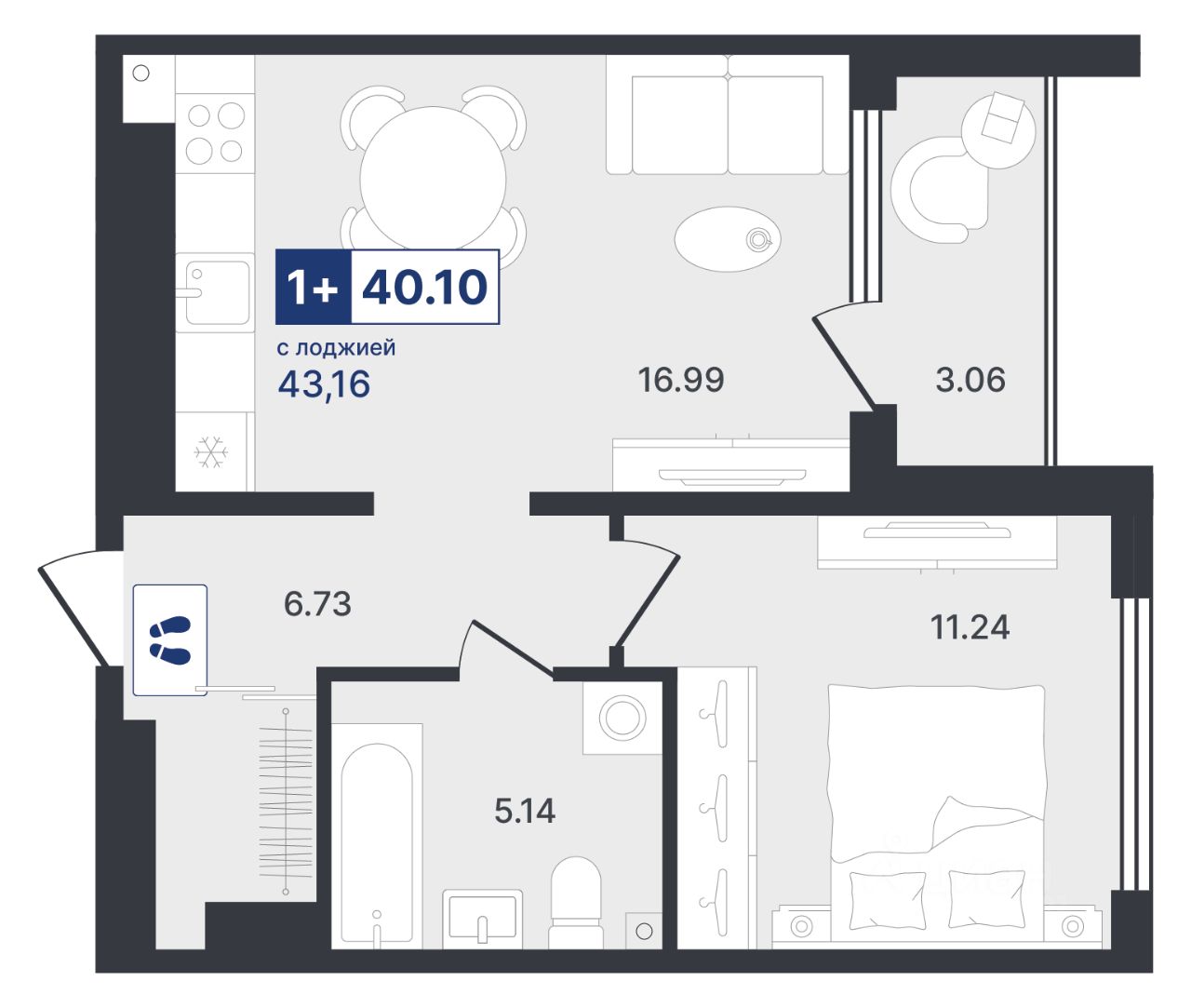 Общая площадь43,16 м²