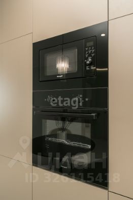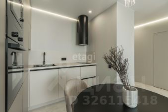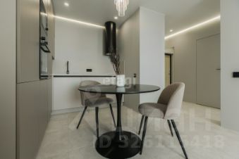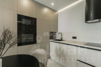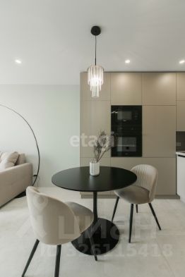 Кухня по дизайн проекту на заказ, с качественной встраиваемой техникой Weissgauff (варочная панель, духовой шкаф, микроволновая печь, холодильник, посудомоечная машина, вытяжка), уютная столовая зона (стол, мягкие стулья). Стиральная машинка расположена в закрытом пенале, включающем места для хранения душевых и прачечных принадлежностей. В кухне-гостиной установлен большой раскладной диван, телевизор, кондиционер.