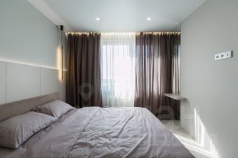 В просторной комнате размещена кровать с панелью, ортопедический матрас Ormatek, туалетный столик с зеркалом, есть свободное место, которое можно оформить на свое усмотрение (детская кровать, шкаф, рабочая зона).