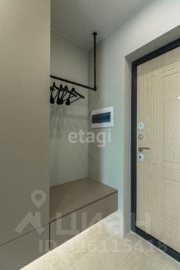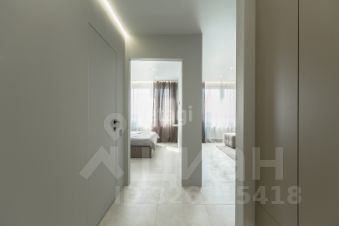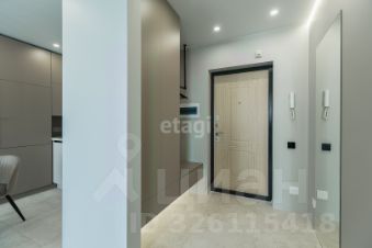 В коридоре стильная гардеробная группа, изготовленная на заказ. Дверь в душевую скрытого монтажа. В квартире установлены большие зеркала в пол, что расширяет пространство и придает эффектный вид.