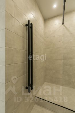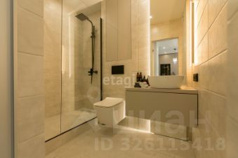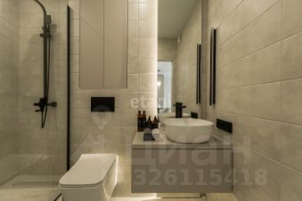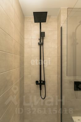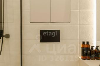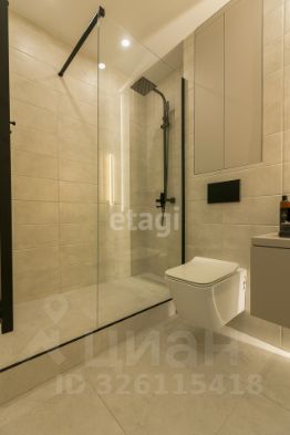 Душевая комната выполнена из плитки, установлен подвесной унитаз с инсталляцией, вертикальный электронный полотенцесушитель, итальянская душевая перегородка Vincea из прочного стекла 8 мм, качественная сантехника из нержавеющей стали, душевая система с тропическим душем. Установлено большое парящее зеркало и локальный светильник. Есть закрытая ниша с полочками и тумба для хранения различных принадлежностей.
