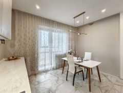 На полу - керамогранитItalon (прихожая, санузел, кухня и лоджия) , гипоаллергенное пробковое покрытие CorkStyle (спальня), потолки с парящим эффектом ,световыми линиями в коридоре и обеденной зоне, создают атмосферу уюта .