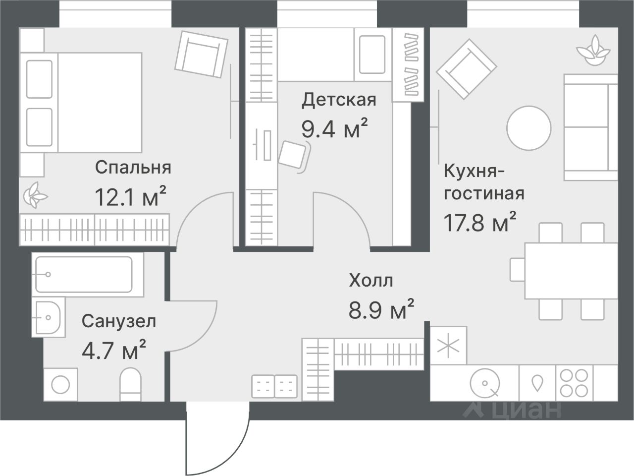 Общая площадь52,9 м²