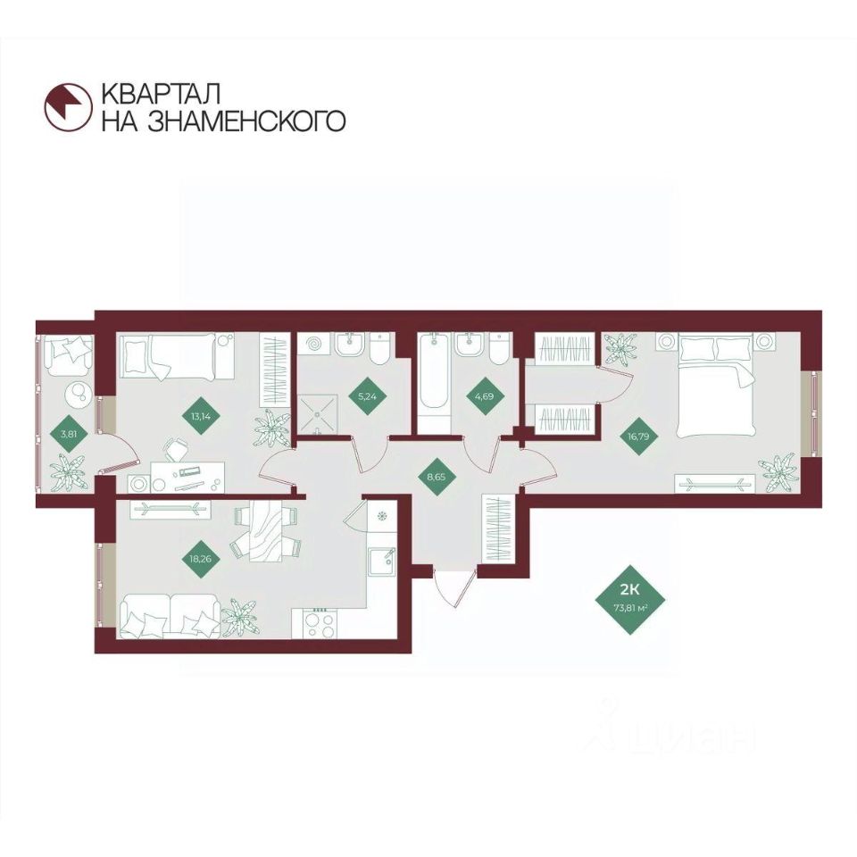 Продаётся 2-комнатная квартира в строящемся доме (2 очередь), срок сдачи: I-кв. 2027, общей площадью 73.81 кв.м., на 3 этаже. "Квартал на Знаменского" - новый жилой комплекс от компании "СтоунСтрой", расположенный по адресу: Тюменская обл., г. Тобольск, ул. 3Б микрорайон, 6Бк2.