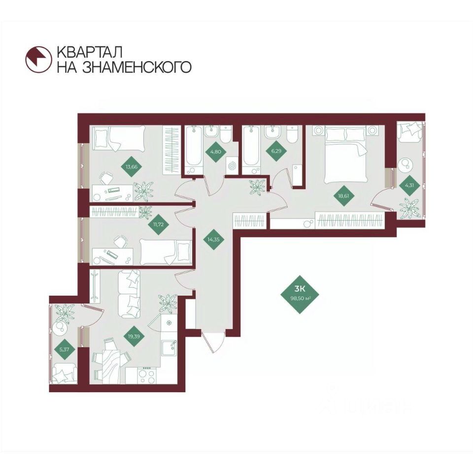 Продаётся 3-комнатная квартира в строящемся доме (2 очередь), срок сдачи: I-кв. 2027, общей площадью 98.5 кв.м., на 10 этаже. "Квартал на Знаменского" - новый жилой комплекс от компании "СтоунСтрой", расположенный по адресу: Тюменская обл., г. Тобольск, ул. 3Б микрорайон, 6Бк2.