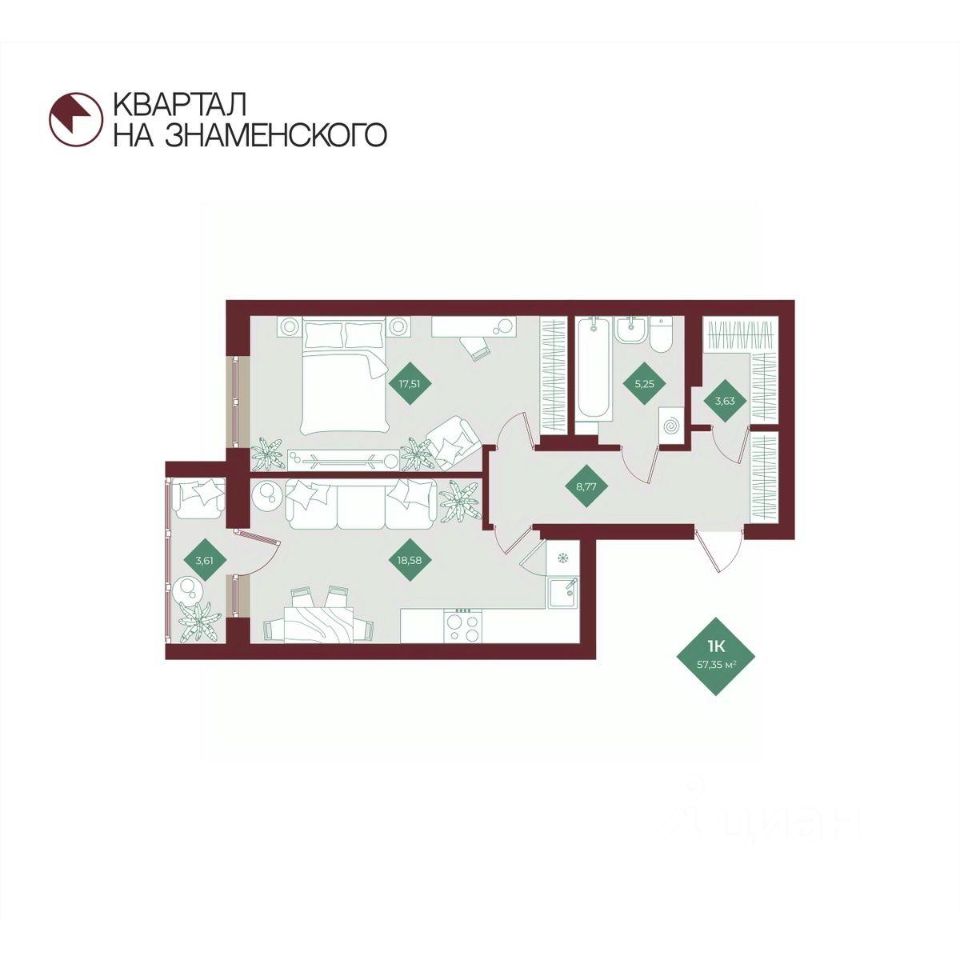 Продаётся 1-комнатная квартира в строящемся доме (2 очередь), срок сдачи: I-кв. 2027, общей площадью 57.35 кв.м., на 1 этаже. "Квартал на Знаменского" - новый жилой комплекс от компании "СтоунСтрой", расположенный по адресу: Тюменская обл., г. Тобольск, ул. 3Б микрорайон, 6Бк2.