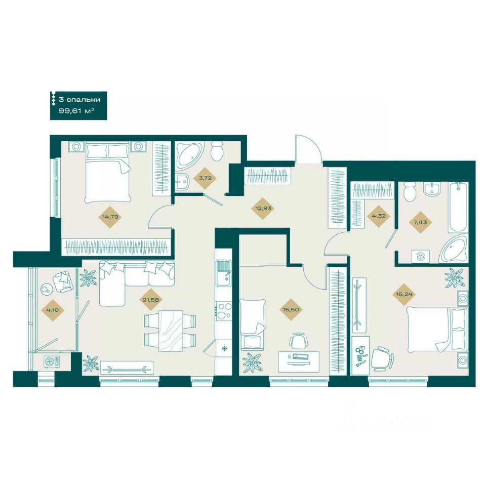 Продаётся 3-комнатная квартира в строящемся доме (Тимофея Кармацкого, 1 ), срок сдачи: IV-кв. 2026, общей площадью 99.61 кв.м., на 22 этаже. Новый жилой комплекс "Секреты" от Специализированного застройщика "СТОУН ДЕВЕЛОПМЕНТ" расположен по адресу: г. Тюмень, по ул. Тимофея Кармацкого.