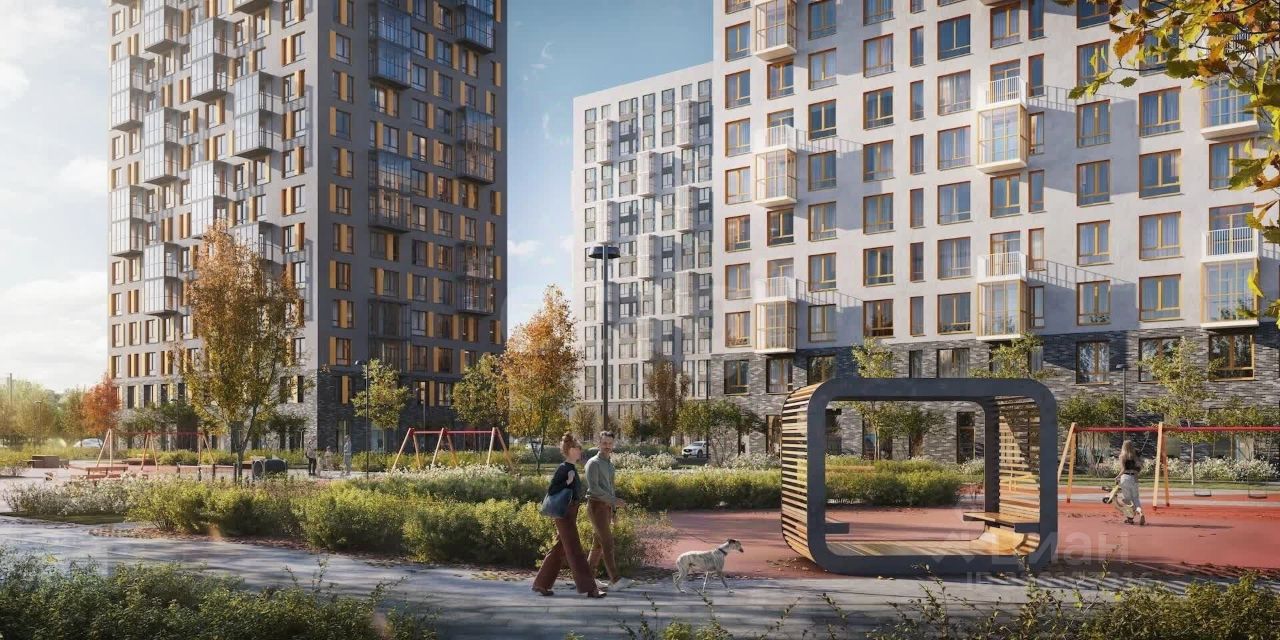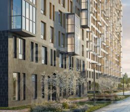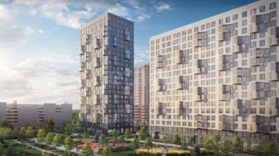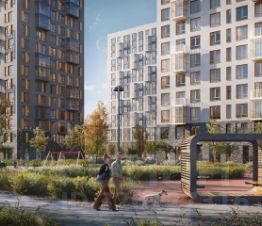Комфортные дома высотой от 17 до 24 этажей, приватные зеленые дворы, собственный спортивный парк. На первых этажах кафе и магазины.