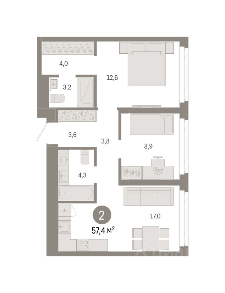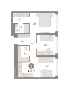 Двухкомнатная квартира с предчистовой отделкой в ЖК "Республики 205" на 7 этаже. Общая площадь: 57.4 кв.м. Высота потолков 2.7 м.