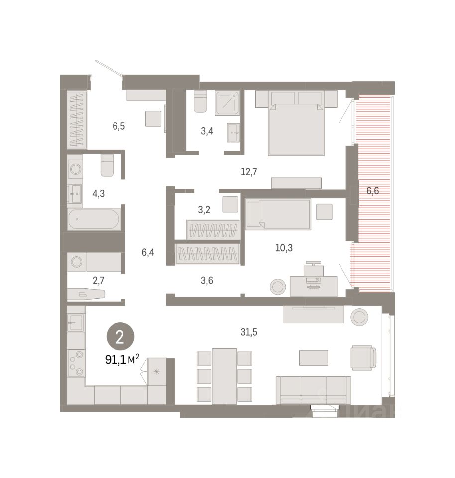 Двухкомнатная квартира с предчистовой отделкой в ЖК "Республики 205" на 4 этаже. Общая площадь: 91.08 кв.м. Высота потолков 2.7 м.