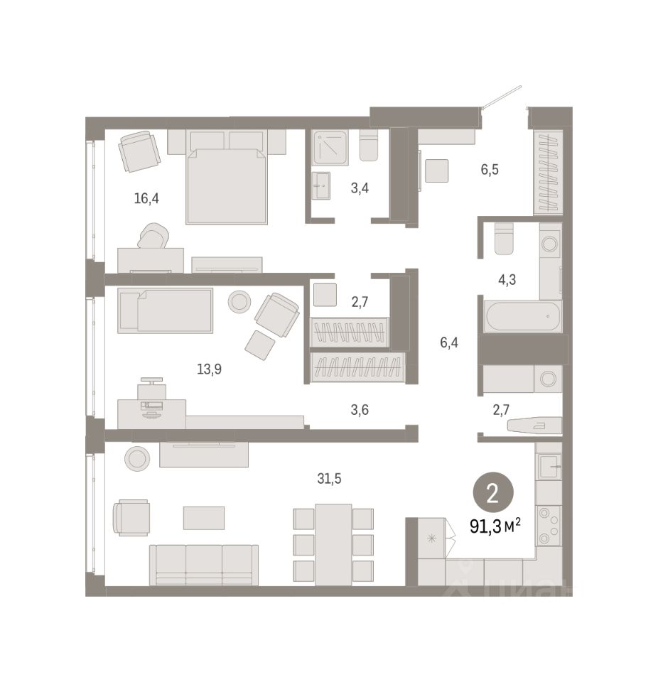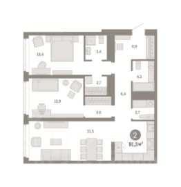 Продается двухкомнатная квартира от застройщика с предчистовой отделкой в ЖК "Республики 205" на 5 этаже. Общая площадь: 91.28 кв.м. Высота потолков 2.7 м.