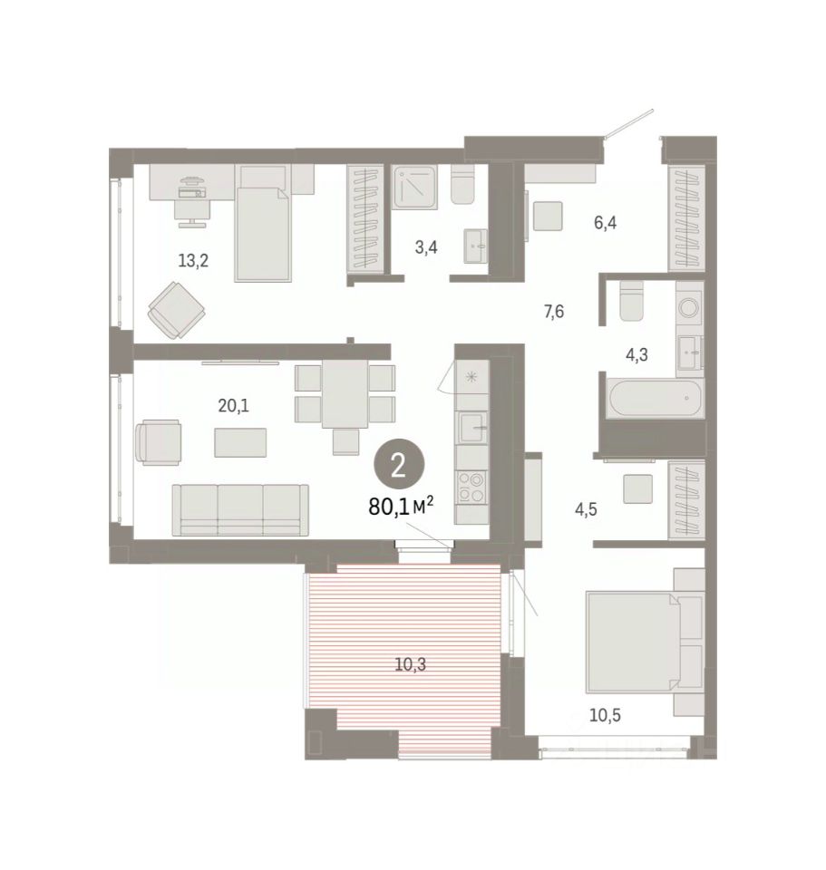 Двухкомнатная квартира от застройщика с предчистовой отделкой в ЖК "Республики 205" на 13 этаже. Общая площадь: 80.12 кв.м. Высота потолков 2.7 м.