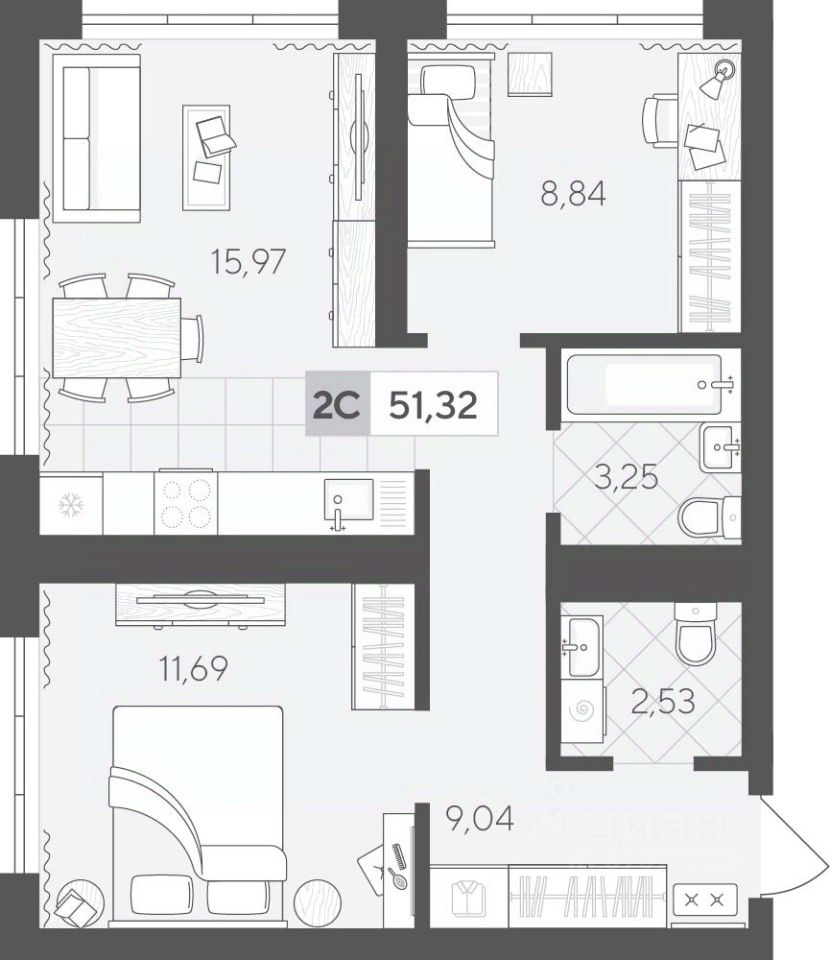 Продаётся 2-комнатная квартира в строящемся доме (ГП 2 (Сергея Корепанова, 34)), срок сдачи: IV-кв. 2027, общей площадью 51.32 кв.м., на 3 этаже. Новый жилой комплекс "Скандиа. Квартал у Леса" от Специализированного застройщика "СКАНДИА У ЛЕСА" расположен в г. Тюмень на ул. Бориса Прудаева.