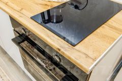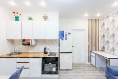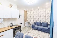 Квартира с качественным современным ремонтом в светлой, нейтральной гамме: на полу практичная ПВХ-плитка, натяжные потолки с точечным освещением создают ощущение простора и уюта. Санузел полностью облицован кафелем, установлена вся необходимая сантехника — ничего доделывать не нужно.