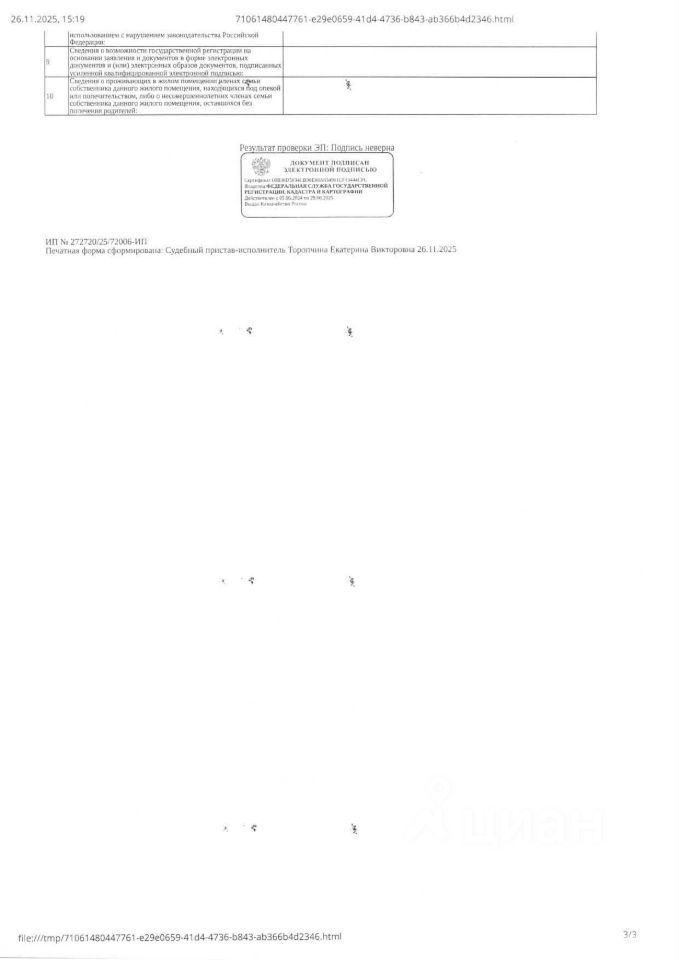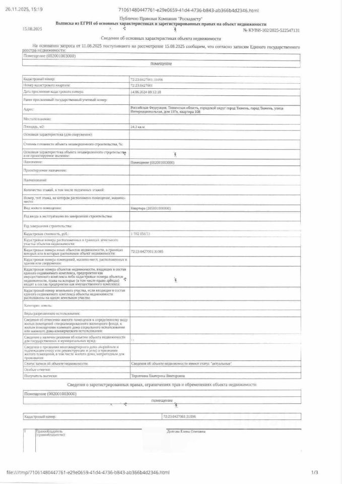 Должник: Плаксина (Долгова) Е.О., собственник: Долгова Е.О. Лот: Жилое помещение (квартира), площадь 24,2 кв.м., кадастровый номер: 72:23:0427001:31096, г. Тюмень, ул. Интернациональная 197В, кв. 108 (зарегистрированные лица отсутствуют, сведенья о задолженности по капитальному ремонту - отсутствует), н/ц: 3315128,80 р., з-к: 3315 р, код: 0014, рег. 72-010468(26);