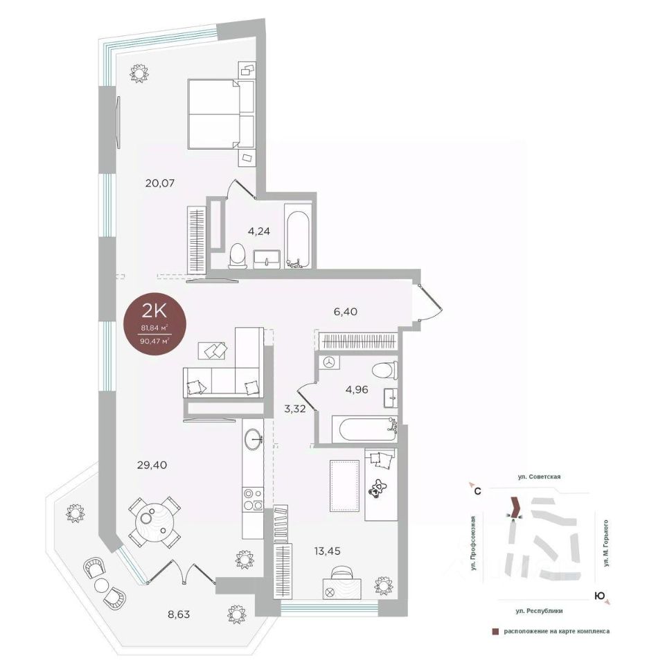 Территория квартала - это квадрат улиц Профсоюзная-Республики-Советская-М.Горького. Застройщиком спроектированы квартиры от студий до четырехкомнатных, общей площадью от 29.6 до 146.3 кв. м. Дома сдаются в предчистовой отделке.