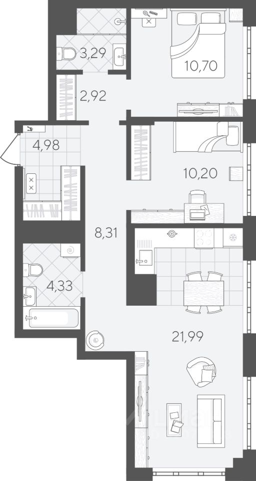 Продуманная геометрия комнат позволит легко зонировать пространство и подобрать необходимую мебель.