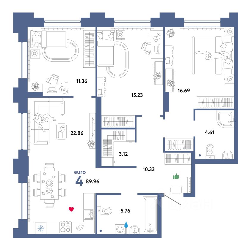 Застройщиком спроектированы квартиры с различными планировками - от студий до четырехкомнатных общей площадью от 28,07 до 131,51 кв. м. Отделочные работы не осуществляются.