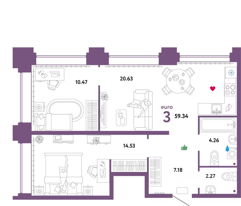 Застройщиком спроектированы квартиры с различными планировками - от студий до четырехкомнатных общей площадью от 28,07 до 131,51 кв. м. Отделочные работы не осуществляются.