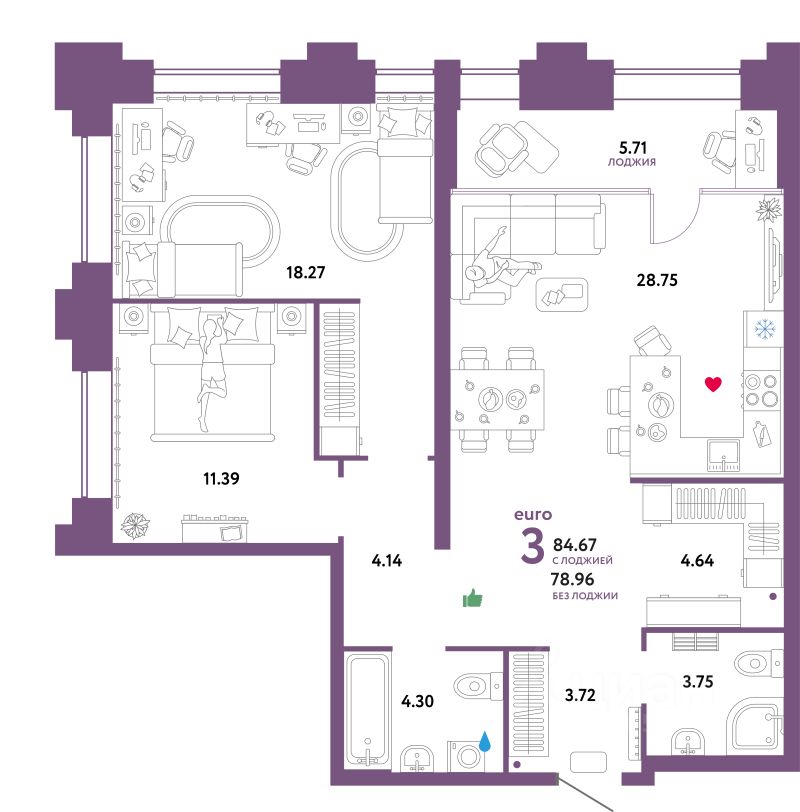 Застройщиком спроектированы квартиры с различными планировками - от студий до четырехкомнатных общей площадью от 28,07 до 131,51 кв. м. Отделочные работы не осуществляются.