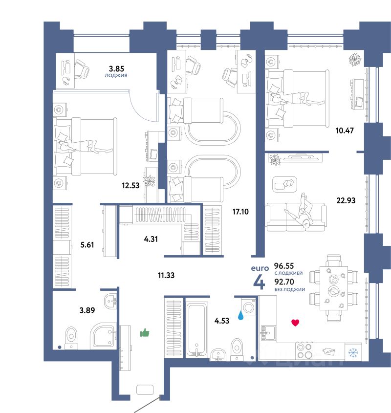 Застройщиком спроектированы квартиры с различными планировками - от студий до четырехкомнатных общей площадью от 28,07 до 131,51 кв. м. Отделочные работы не осуществляются.