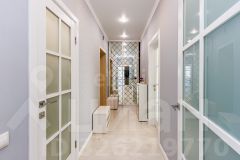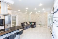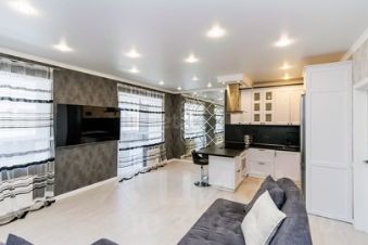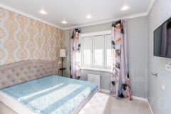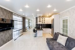 В квартире сделан современный ремонт по дизайн-проекту в светлых тонах с использованием только качественных материалов. Натяжные потолки, Стены выровнены под маяк, интересное сочетание обоев, на полу в комнатах и прихожей кварцвинил, в санузле керамогранит, на лоджии ламинат с системой "теплый пол". Оригинально выделена кухонная зона.