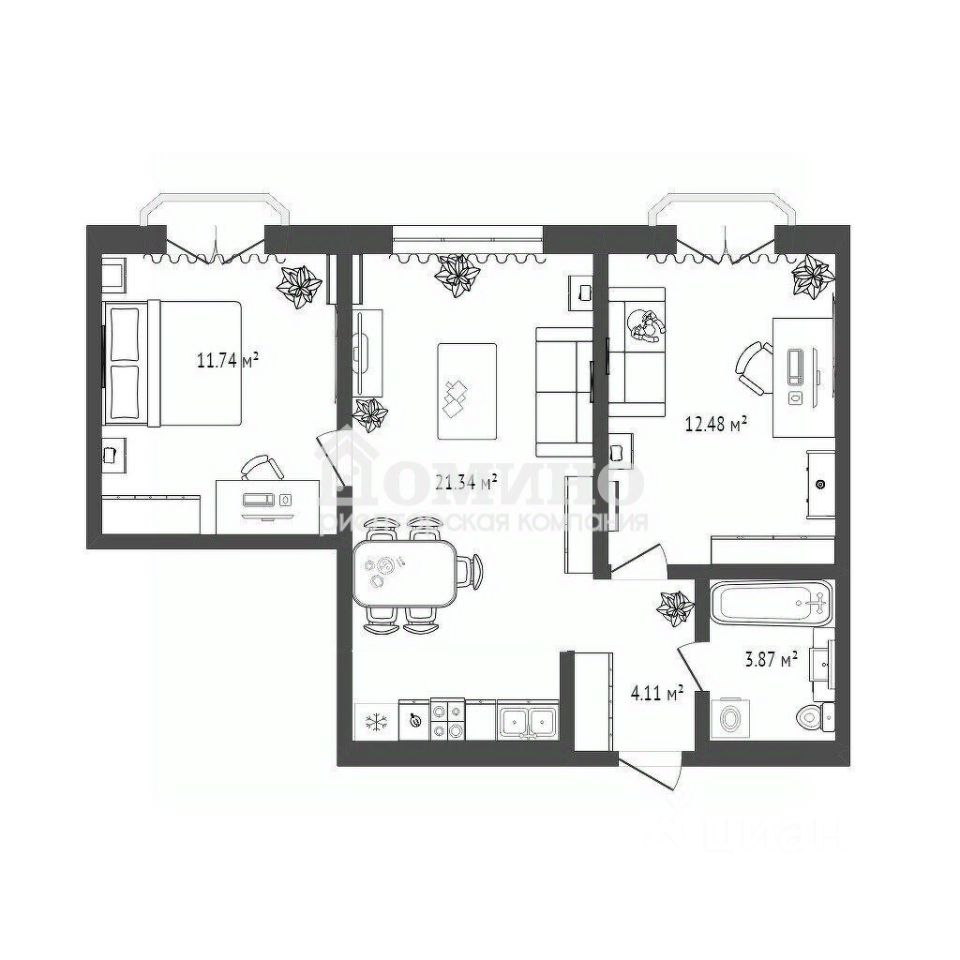 Самая эргономичная и правильная планировка двушки, каждый квадратный метр функционален.