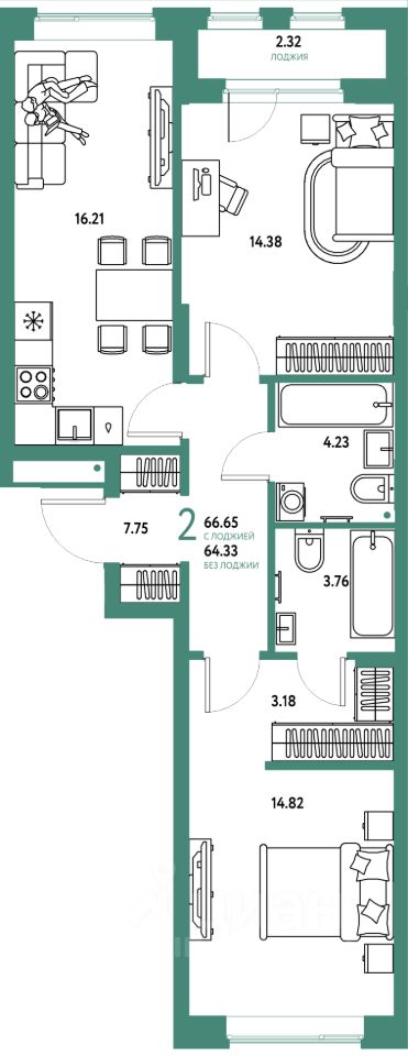 Продаётся 2-комнатная квартира в строящемся доме (Дом "Экологичный" (ГП-19)), срок сдачи: IV-кв. 2026, общей площадью 66.65 кв.м., на 2 этаже. Новый микрорайон "Домашний" от группы компаний "Страна Девелопмент" расположен в Калининском округе Тюмени, в районе аэропорта "Плеханово".