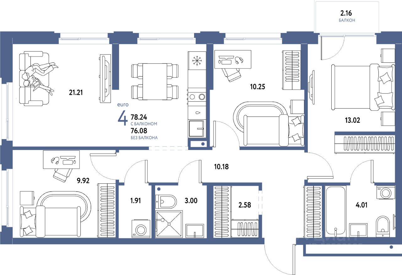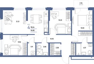Продаётся 4-комнатная квартира в строящемся доме (Дом "Инновационный" (ГП-24)), срок сдачи: IV-кв. 2026, общей площадью 78.24 кв.м., на 6 этаже. Новый микрорайон "Домашний" от группы компаний "Страна Девелопмент" расположен в Калининском округе Тюмени, в районе аэропорта "Плеханово".