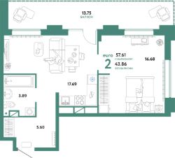 Продаётся 2-комнатная квартира в сданном доме (Кореневского, 5 (Дом "Центральный" ГП-12)), срок сдачи: I-кв. 2025, общей площадью 57.61 кв.м., на 9 этаже. Новый микрорайон "Домашний" от группы компаний "Страна Девелопмент" расположен в Калининском округе Тюмени, в районе аэропорта "Плеханово".