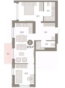 Квартира с кухней-гостиной и двумя спальнями в Октябрьском на Туре. Особенности планировки: балкон, предчистовая отделка.