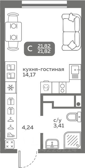 Прямая продажа от застройщика! Продается студия в строящемся ЖК "Меридиан Слобода", срок сдачи: I-кв. 2027, общей площадью 21.82 м², на 5 этаже из 20. Площадь кухни — 14.17 м².