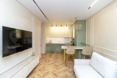 Просторная квартира формата 2+ в жилом комплексе "Европейский берег" готова к заселению и предлагает новый качественный ремонт, выполненный по дизайн-проекту в стиле неоклассики.