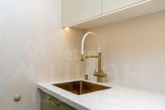 Центром притяжения становится светлая кухня-гостиная, где установлен гарнитур с деревянными фасадами и каменной столешницей, а также вся необходимая встроенная техника: индукционная плита, духовой шкаф с инвектором, посудомоечная машина, холодильник, микроволновая печь с грилем, система очистки воды и отдельный кран с фильтром. Для комфортного микроклимата предусмотрен кондиционер.