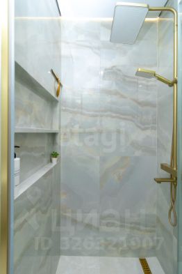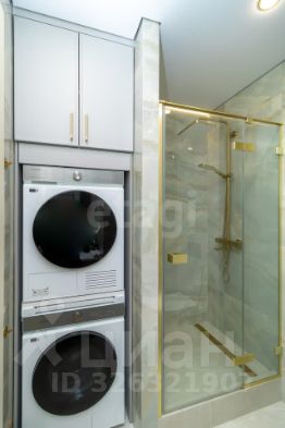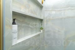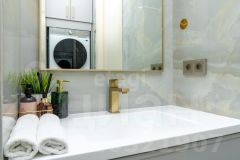 Прихожая дополнена системой хранения с секцией для техники. В санузле уложен керамогранит, смонтирован теплый пол, выделена душевая зона с тропическим душем, установлена каменная мойка и предусмотрено место для стиральной и сушильной машин с фильтрами для воды.