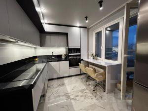 В квартире свежий современный ремонт. На полу керамогранит и ламинат, на стенах современные качественные обои, потолок натяжной с точечными и трековыми светильниками. Балкон с панорамными окнами с видом на улицу. Современная мебель и бытовая техника.