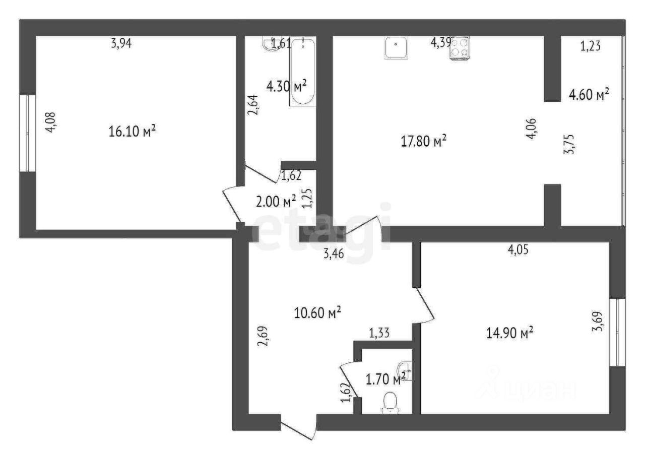 Основное пространство организовано как кухня-гостиная 23 кв. м, дополненная двумя изолированными комнатами 16 и 15 кв. м.