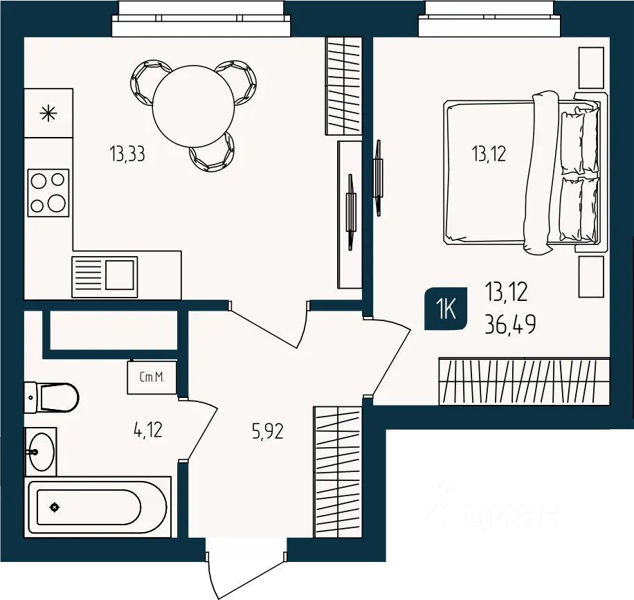 Продаётся 1-комнатная квартира в строящемся доме (Дом Каскад (ГП-2)), срок сдачи: III-кв. 2027, общей площадью 36.49 кв.м., на 24 этаже. Новый жилой комплекс "Квартал Мятный" от Специализированного застройщика "Юпитер" расположен по адресу: г. Тюмень по ул. Кулибина.
