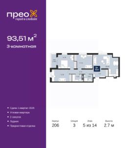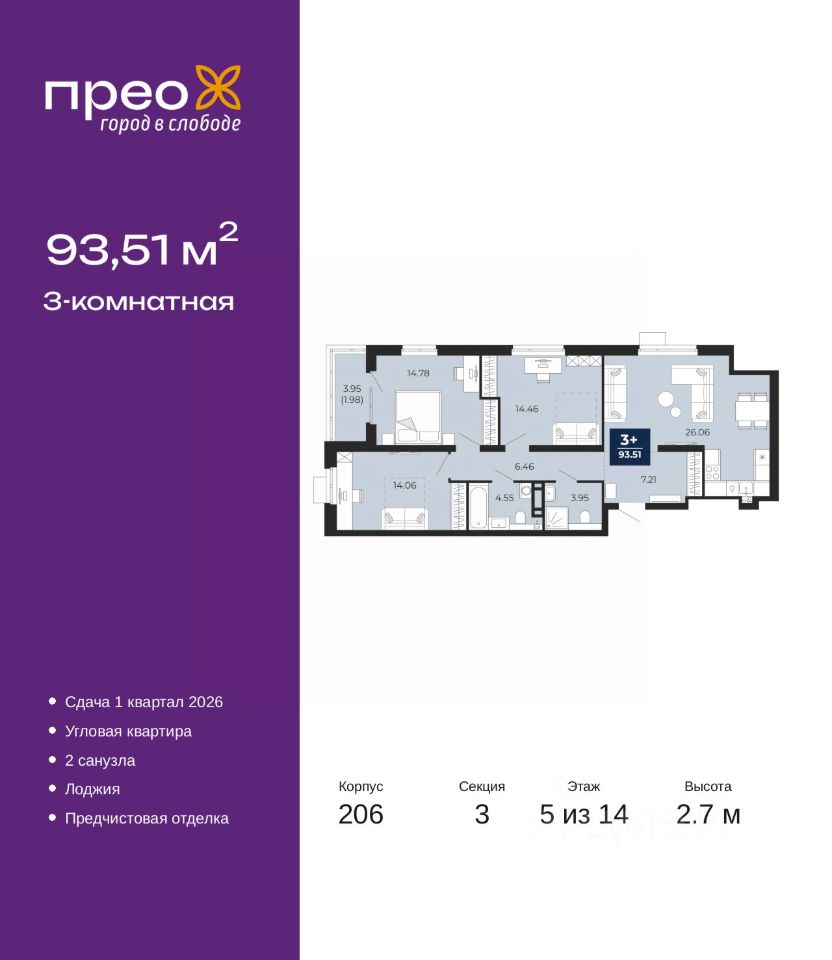 Трехкомнатная квартира с предчистовой отделкой в ЖК "Прео" на 5 этаже. Общая площадь: 93.51 кв.м., жилая: 43.3 кв.м., площадь просторной кухни-столовой: 26.06 кв.м. Угловая квартира, окна oбecпeчивaют paвнoмepнoe ocвeщeниe в тeчeниe дня. В квартире одна лоджия, два совмещенных санузла. Высота потолков 2.7 м.