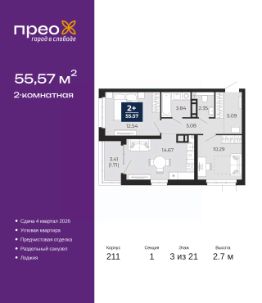 Двухкомнатная квартира от застройщика с предчистовой отделкой в ЖК "Прео" на 3 этаже. Общая площадь: 55.57 кв.м., жилая: 22.83 кв.м., площадь просторной кухни-столовой: 14.67 кв.м. Квартира угловая, окна oбecпeчивaют paвнoмepнoe ocвeщeниe в тeчeниe дня. В квартире одна лоджия, один раздельный санузел. Высота потолков 2.7 м.
