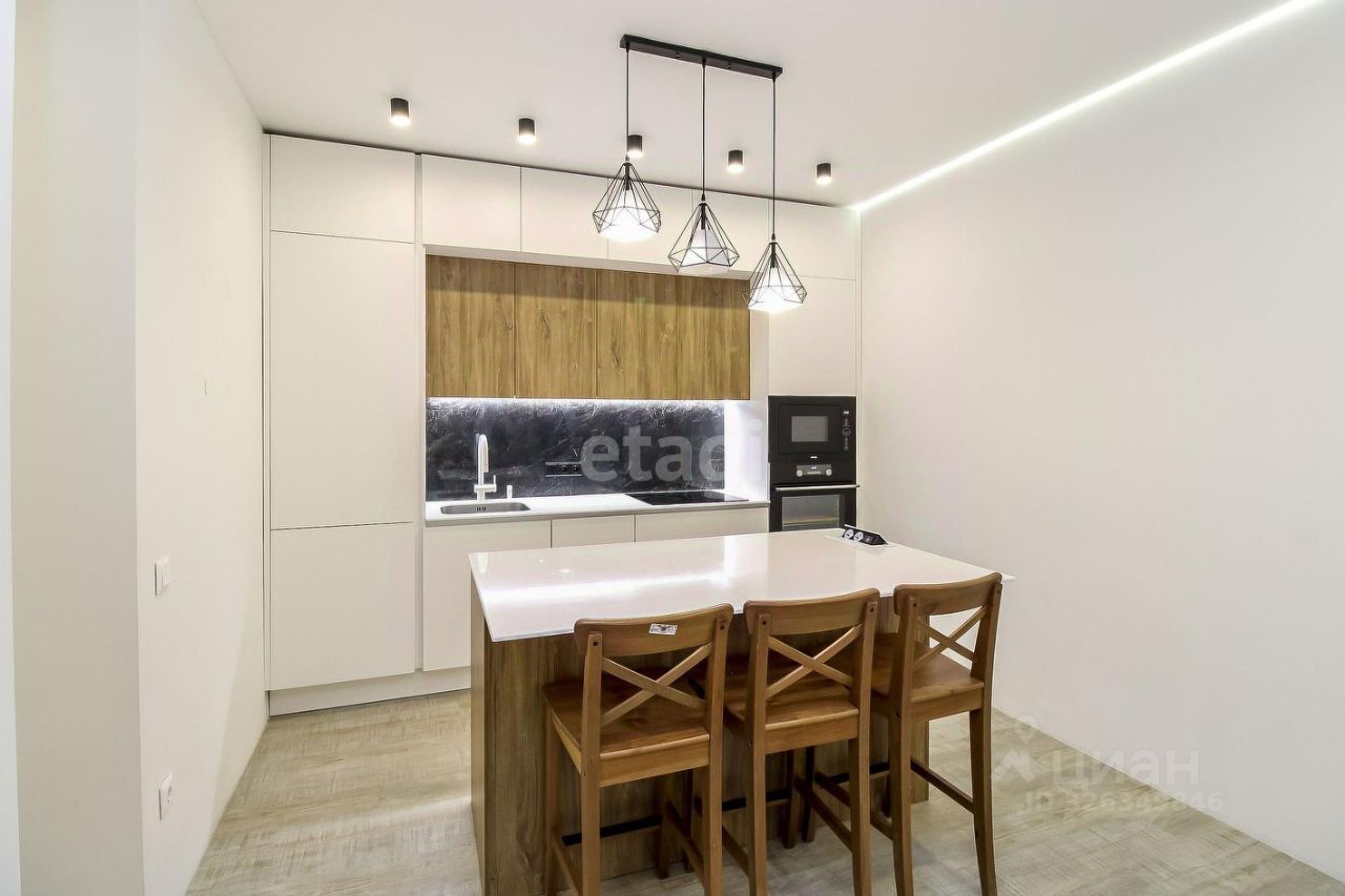 На кухне установлен гарнитур, который изготавливался под заказ, все продумывалось до мелочей, у фасадов специальное покрытие на котором не остаются пятна. Фартук из цельного керамогранита, техника встраиваемая немецкого производства (холодильник, посудомоечная машина, варочная панель, дух шкаф, вытяжка и микроволновка). Смеситель, встроенный дозатор и мойка фирмы Franke.