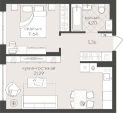 Однокомнатная квартира 42.49 кв.м на 3 этаже с просторной кухней-гостиной. Здесь легко создать уютное пространство для встреч, а отдельная спальня обеспечивает комфорт и личное пространство..
