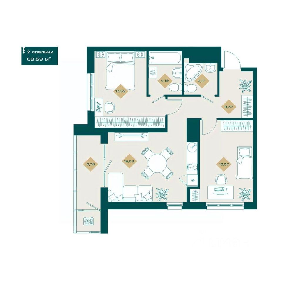 Продаётся 2-комнатная квартира в строящемся доме (Тимофея Кармацкого, 1 ), срок сдачи: IV-кв. 2026, общей площадью 68.63 кв.м., на 19 этаже. Новый жилой комплекс "Секреты" от Специализированного застройщика "СТОУН ДЕВЕЛОПМЕНТ" расположен по адресу: г. Тюмень, по ул. Тимофея Кармацкого.