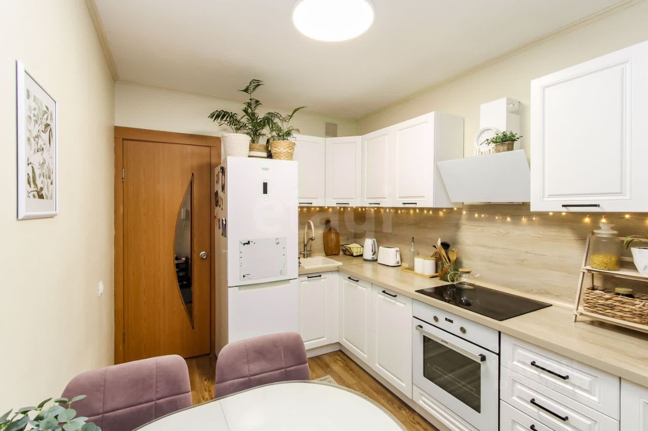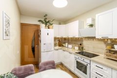 В подарок будущему владельцу останется новый красивый кухонный гарнитур с варочной панелью, холодильником, вытяжкой и посудомоечной машиной, духовым шкафом.